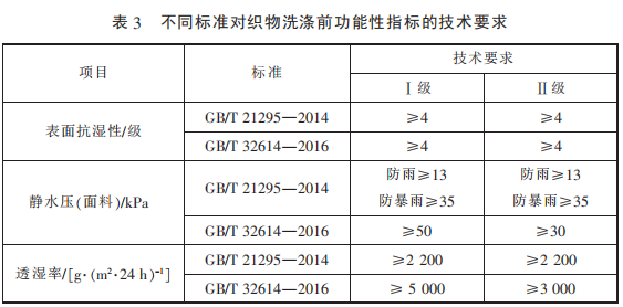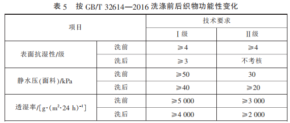考慮到防水透濕面料功能的 耐用性,GB/T 32614—2016 中增加 了對功能性指標(biāo)的洗后測試,采用 標(biāo)準(zhǔn) GB/T 8629—2001《紡織品 試 驗(yàn)用家庭洗滌和干燥程序》 中 的 5A 程 序 洗 滌 3 次 并 懸 掛 晾 干,洗 后的指標(biāo)要求變化具體見表 5,相 較于洗前,指標(biāo)略有降低。