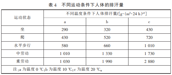 GB/T 32614—2016 中 功 能 性 指 標(biāo)(洗 前)與 GB/T 21295—2014 《服裝理化性能的技術(shù)要求》對比 可知,GB/T 32614—2016 中對于拒 水、耐靜水壓和透濕率 3 項(xiàng)功能性 要求更高,尤其是Ⅰ類產(chǎn)品的耐靜 水壓和透濕率遠(yuǎn)高于 GB/T 21295— 2014 的技術(shù)要求。兩標(biāo)準(zhǔn)對這 3 項(xiàng) 性能要求對比見 表 3。 滿 足 GB/T 32614—2016 的沖鋒衣可以抵擋暴 雨的沖擊,也滿足登山、攀巖等大 運(yùn)動量下的透濕要求,不同條件下 人體的排汗量見表 4。