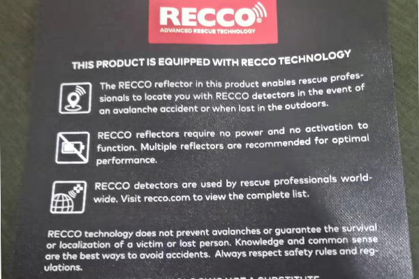 思諾華服飾&睿牛制衣是一家20年主營沖鋒衣、滑雪服的定制生產(chǎn)廠家,20年制作研究戶外服裝,戶外服裝的制作工藝、功能性都要求嚴格,對于這一RECCO,它是雪崩救援系統(tǒng)的簡稱,RECCO 是用于定位雪崩受難者的電子系統(tǒng)。