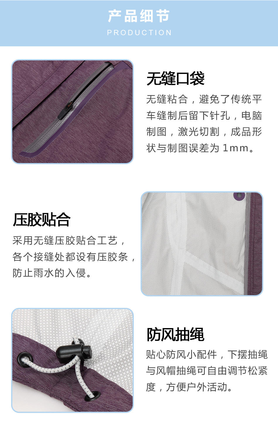 防風抽繩:貼心防風小配件,下擺抽繩與風帽抽繩可自由調節松緊度,使戶外過膠沖鋒衣更方便戶外活動。