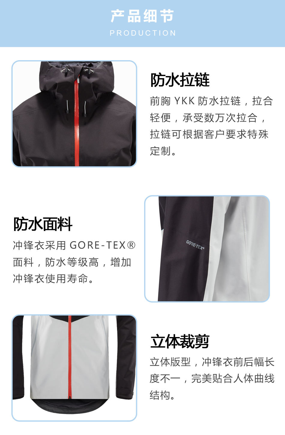 防水面料:沖鋒衣采用GORE-TEX?面料,防水等級(jí)高,增加沖鋒衣使用壽命。